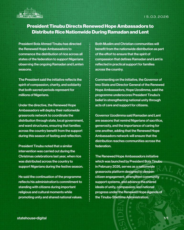 “Under the directive, the Renewed Hope Ambassadors will coordinate the distribution through their nationwide grassroots network to ensure that families across Nigeria benefit from the intervention during this holy season when both Muslims and Christians are fasting,” the statement said.